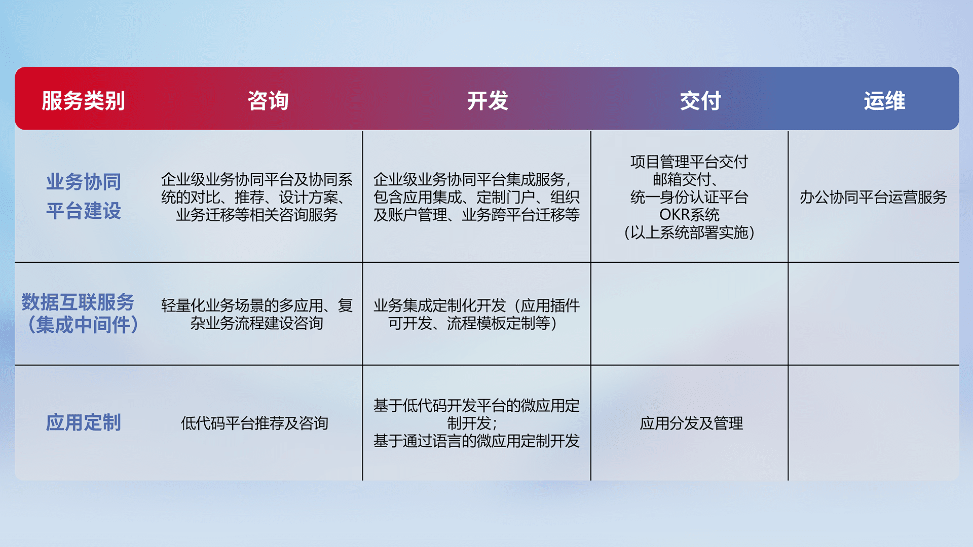 针对钉钉、、企微、、、、IDaas等平台级产品提供产品的规划、、、方案、、交付、、、、定制化开发等服务,,,实现如统一协同办公、、智能客户服务、、混合会议管理、、、、智能数据查询、、等业务场景,,,实现数字化转型。。